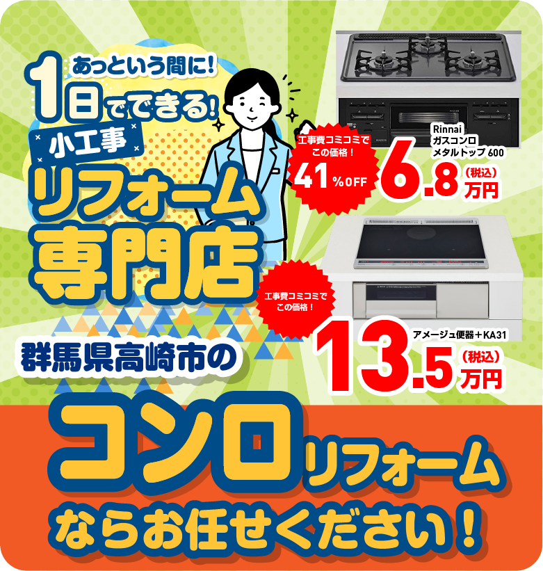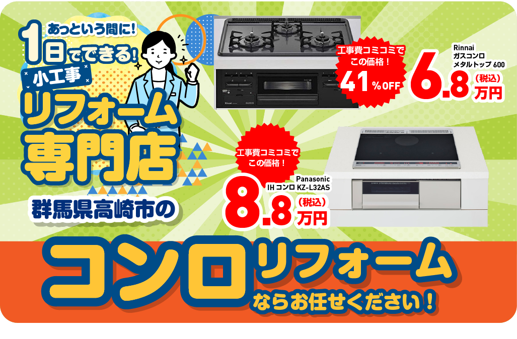 グンシナリフォームなら、コンロリフォーム商品、古い商品の廃棄料、工事費まで全部コミコミ!だから予算が立てやすいし、安心です!目的に応じて最適な商品をご提案しますので、お気軽にご相談ください。