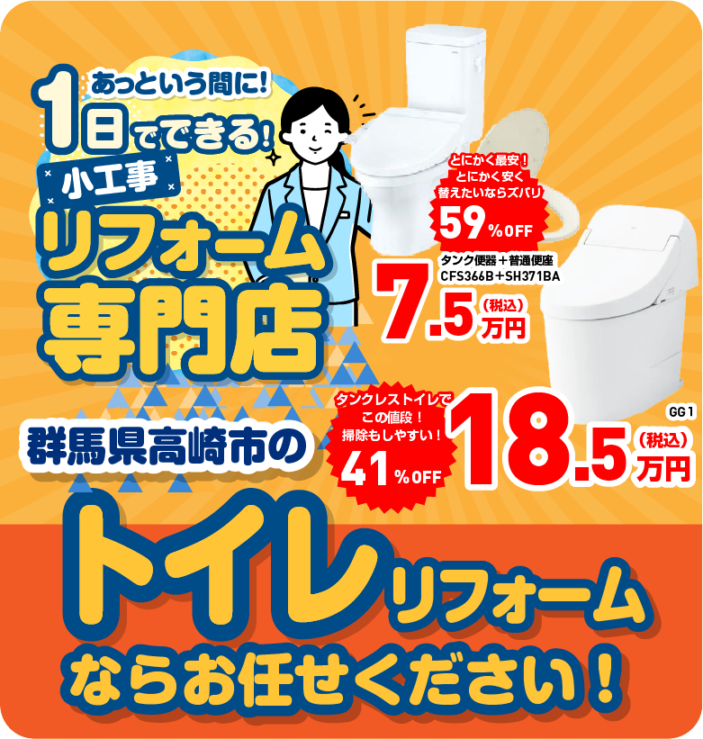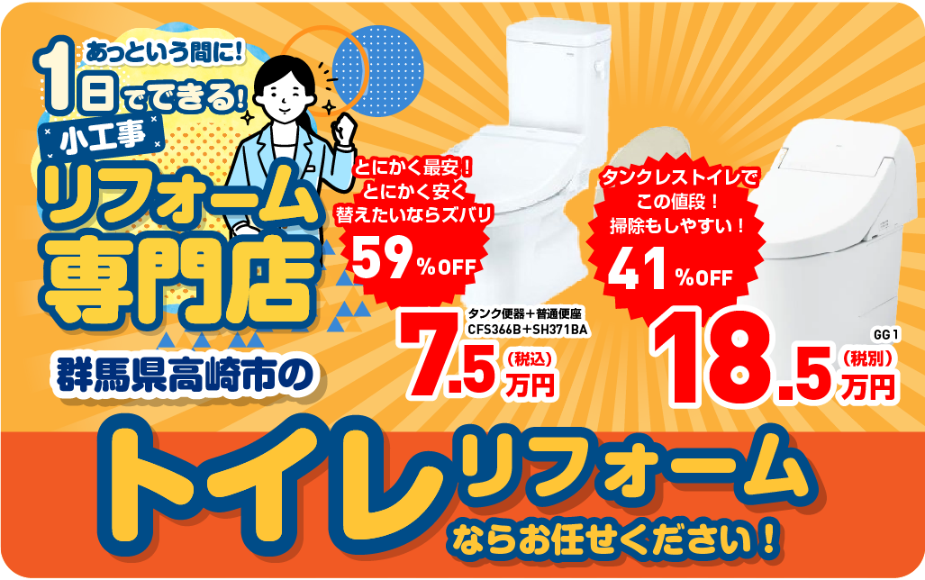 機器交換専門のリフォーム会社「グンシナリフォーム」が運営するトイレの専門店です。専門店ならではの知識と、長年培ってきた経験から、地域のお客様のお困りごとに寄り添い、お客様により快適な暮らしをご提案させていただきます。